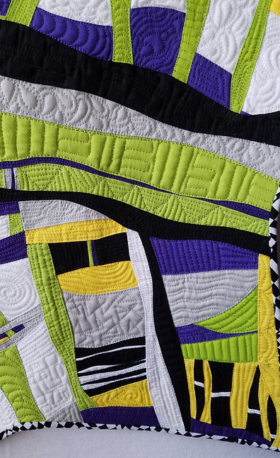 "Which Street? " 30" x 30" I learned this technique from Sheila Frampton Cooper. Sew random shapes together-no raw edges. I've included lots of closeups of the free motion quilting. I quilted a different motif in each shape. (All sewn on my Babylock Elisimo Gold domestic sewing machine)